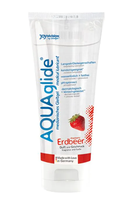A medical-grade, water-based strawberry lubricant from JOYDIVISION AQUAGLIDE. Clinically dermatologically tested and condom-safe, it gives a smooth, long-lasting glide without grease or stains. Handy 100 ml bottle that’s gentle on skin and suitable for use with most toys — a reliable choice if you want a flavoured, easy-to-wash lubricant that won’t interfere with latex condoms.