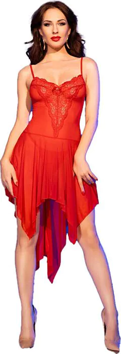 Experience a delightful mix of charm and allure with this red babydoll crafted from sheer mesh tulle. The romantic lace detailing on the front captures attention while maintaining an air of mystery. The flared rectangular hem enhances the feminine silhouette, making it both light and irresistibly sensual.