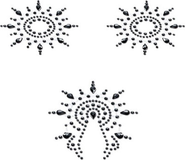 These are decorative crystal nipple pasties designed to sit on the skin of the breasts or pubis. They’re a styling accessory rather than a wearable garment: think of them as jewellery for your body. The set contains three pieces and is intended for occasional wear — under lingerie for a subtle hint or shown off during a strip or performance. They’re described as comfortable and easy to remove, and the crystals stick to skin using adhesive backing.