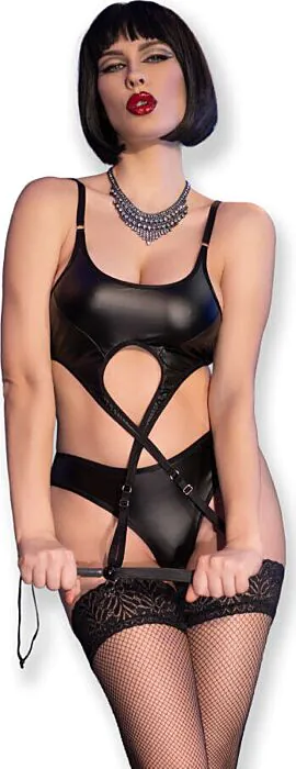 This CHILIROSE CR 4625 set is a four-piece crotchless lingerie outfit designed for nights when you want to be both comfortable and coy. The main fabric is eco-leather, which feels soft and has a slight stretch — that means a snug, shaping fit rather than rigid or itchy material. The set includes an adjustable garter-top, a crotchless thong, matching stockings and a high-quality silicone whip as a playful accessory.