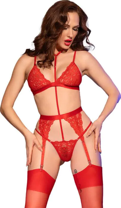 | Includes | Adjustable-back lace bra; suspender (suspender belt); thong with neck‑string; cabaret-style stockings |