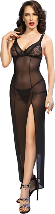 This elegant long babydoll combines soft, semi-transparent lace with a flattering design that hugs your curves. Perfect for those who appreciate both comfort and sophistication. It also includes a matching thong for that added touch of elegance.
