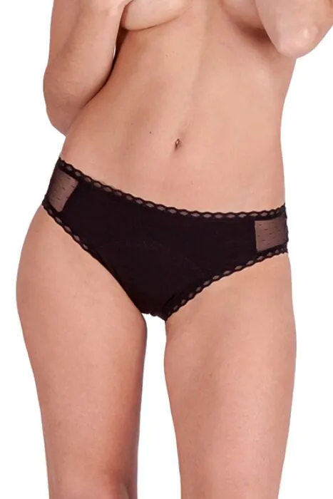 As I would tell you in the shop: these are menstrual briefs made for everyday use when your flow is light to regular. They feel much like ordinary briefs but carry an internal reinforced panel that runs from the gusset up to the lumbar area — that gives more coverage where you need it without adding bulk. The shorts-style cut is elastic and adaptable, with delicate trims and side transparencies if you prefer a more feminine finish.