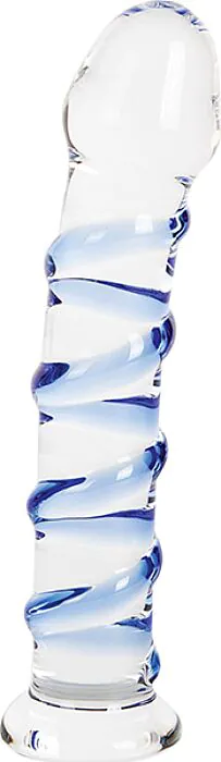 This is a precision glass dildo made from high-strength glass with clear and blue accents. In person you’ll notice the slightly curved shaft, spiral raised ridges and a wider tip shaped like a glans — all designed to give focused, firm stimulation whether you use it vaginally or anally. The flat base gives a secure grip and can work with harnesses that accept a small O-ring. One of the best things about glass: you can play with temperature for extra sensation.