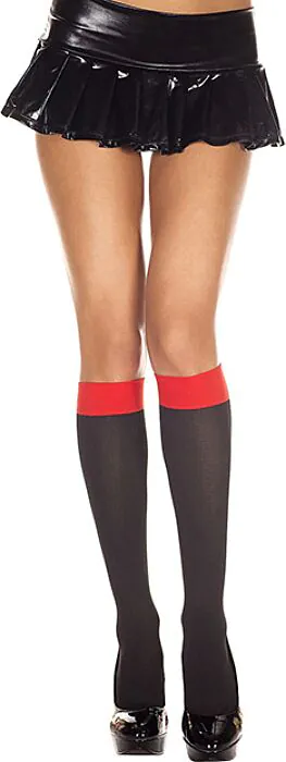 A straightforward two‑tone opaque sock from Music Legs — less elaborate than sheer or patterned hosiery, aimed at solid coverage and bold contrast. Level: beginner to intermediate for styling and everyday use.