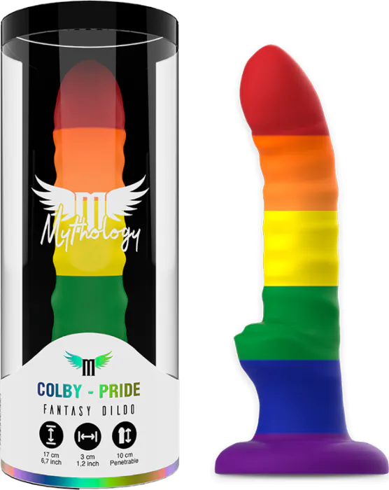 Unleash your fantasies with the Mythology Her Colby Pride Dildo, featuring a flexible design and made from soft, skin-safe silicone. With a strong suction base, it stays put for hands-free enjoyment, while its compatibility with the Fantasy Harness line opens up exciting possibilities.