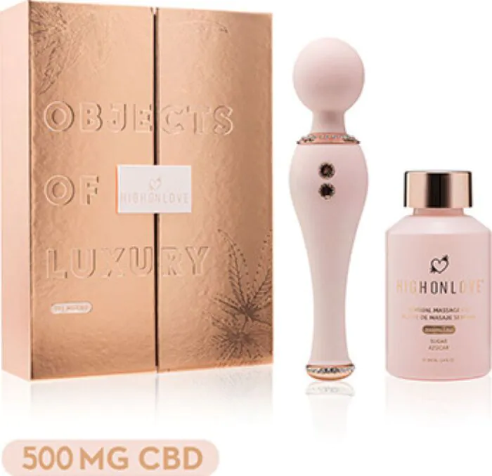 Elevate your intimate moments with a powerful wand massager and soothing CBD massage oil. The High On Love pleasure kit combines a sleek, ergonomic design with soft silicone and five potent vibration patterns to deliver exquisite sensations. Perfectly crafted for precise control, this wand is indicado for targeting sensitive areas.