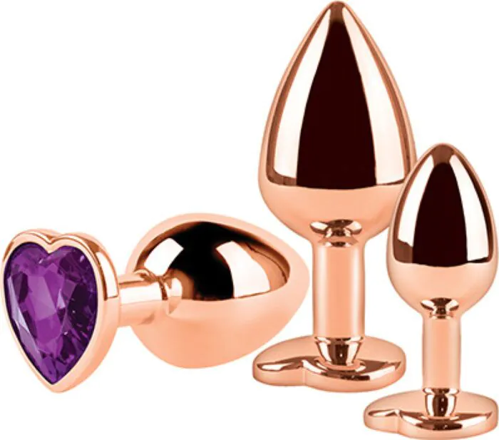 As I’d explain in the shop: this is a pack of three metal anal plugs, all sharing the same slim, tapered shape but in increasing sizes. They’re aimed at people who want to work up to fuller penetration at their own pace. The shiny bronze body is smooth and rigid, while the flat base is finished with a light-blue heart jewel that gives a secure, easy-to-hold stop and a decorative touch.