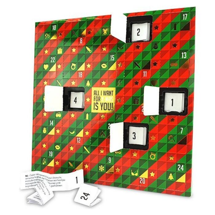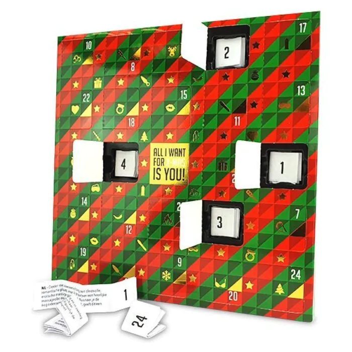 Get ready for an unforgettable Christmas with the Erotic Advent Calendar! This exclusive product offers you the chance to surprise your partner with 24 erotic challenges designed to ignite the flame of passion and fun this festive season.