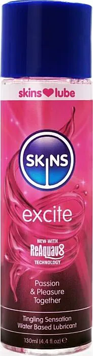 SKINS Excite is a water-based lubricant designed to heighten sensation rather than just reduce friction. If you want a lube that gives a noticeable tingling warm-up, this is the one to try — it contains L-arginine plus red clover and Ginkgo biloba extracts to boost local blood flow and increase responsiveness. The gel is clear, non-staining and comes in a 130 ml bottle.