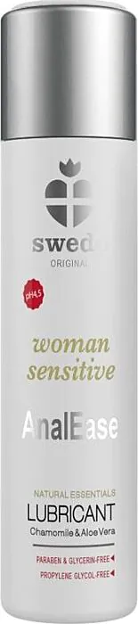 Experience comfort and care with Swede's Woman Sensitive Anal Ease. This water-based lubricant is enriched with Aloe Vera and Chamomile to soothe and prevent irritation, making it a thoughtful choice for intimate wellness.